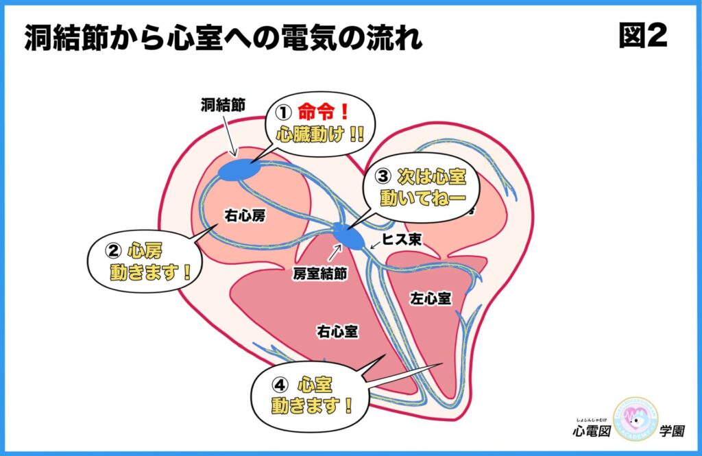 普段はさ、洞結節が“司令塔”みたいに命令(電気信号)を出して、その合図が心房に伝わってから、房室結節っていう“中継点”を通って心室に届くんだよね。