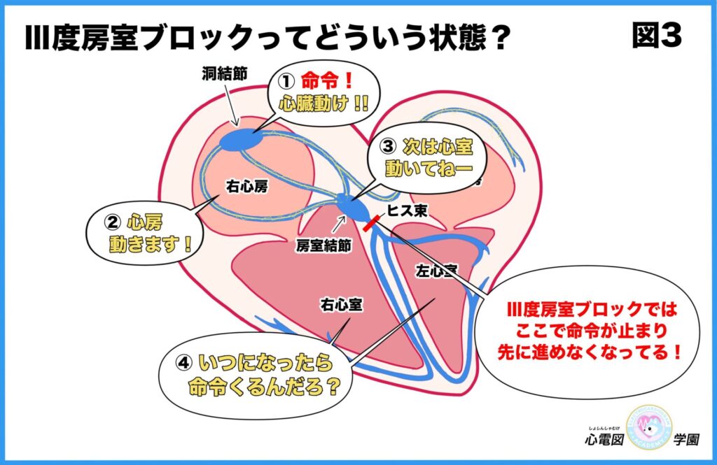 簡単に言うとね、心房と心室の間で電気がまったく伝わらなくなってしまう状態なんだ。