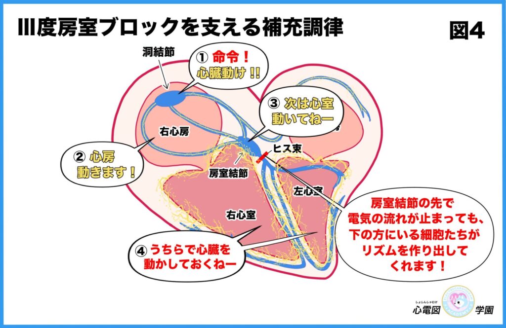 房室接合部(房室結節やヒス束)や、心室自体が勝手に動き出して心拍を保ってくれるんだよ。