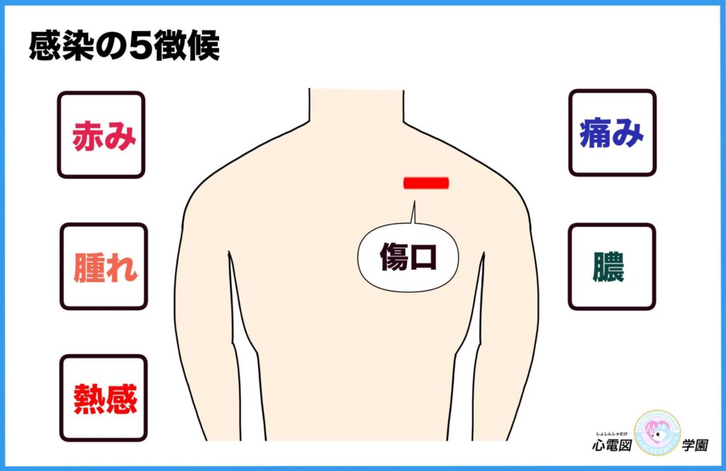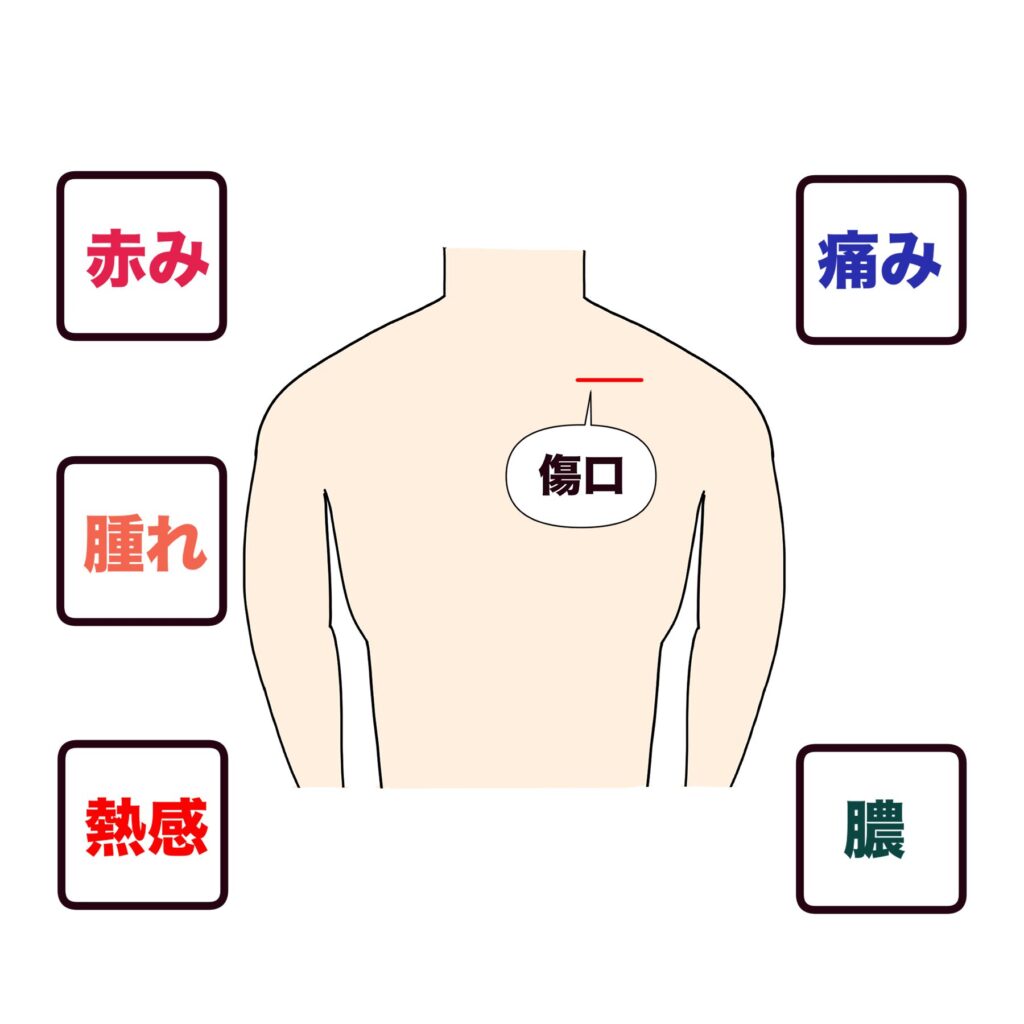 - 感染サインは赤み・腫れ・熱感・痛み・膿