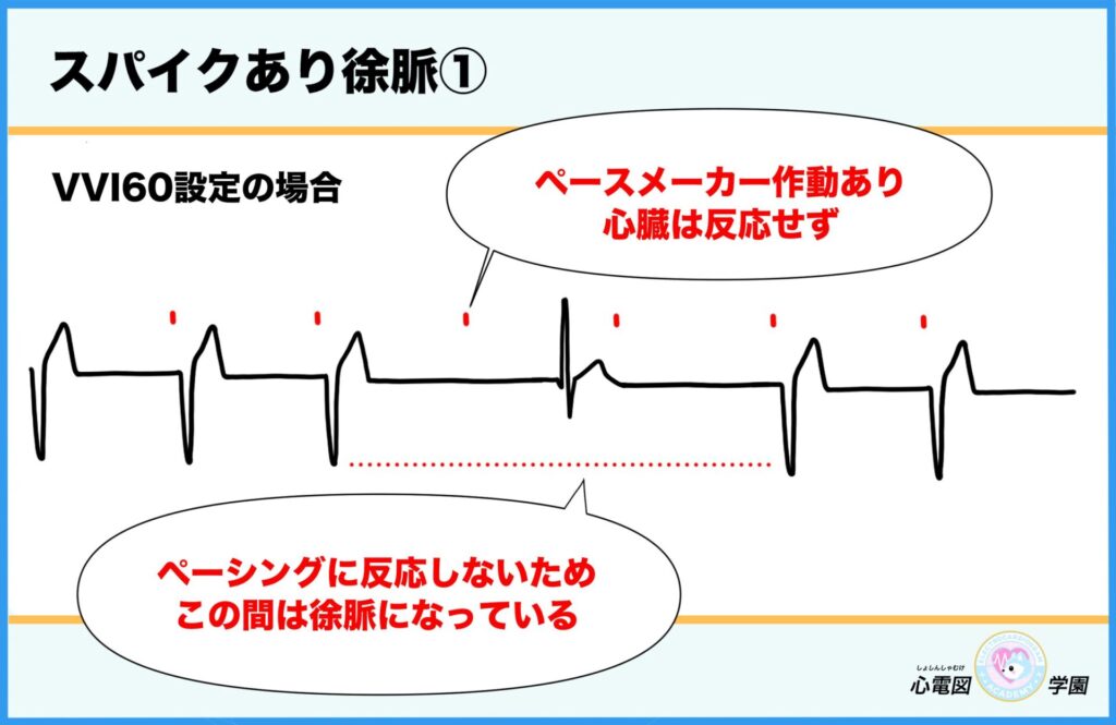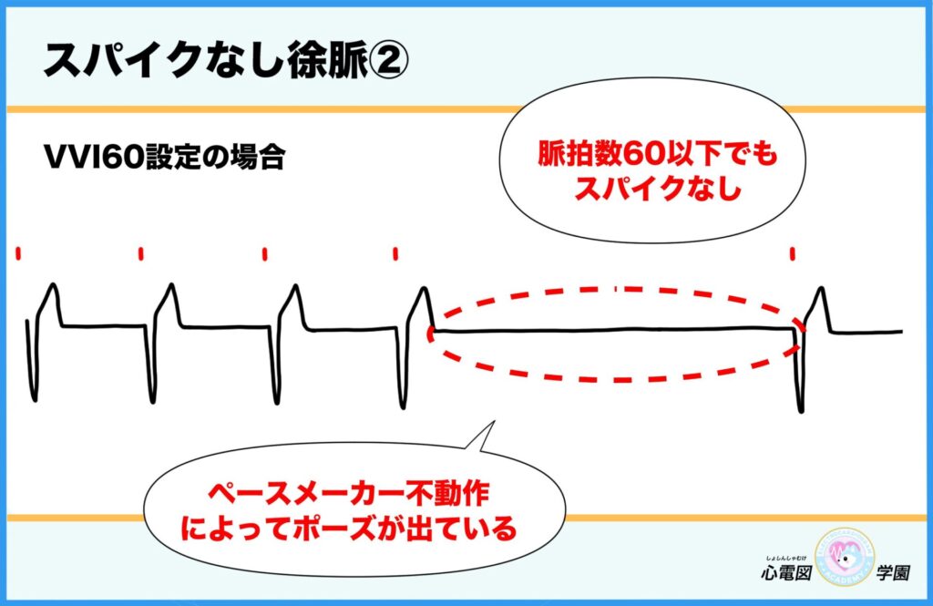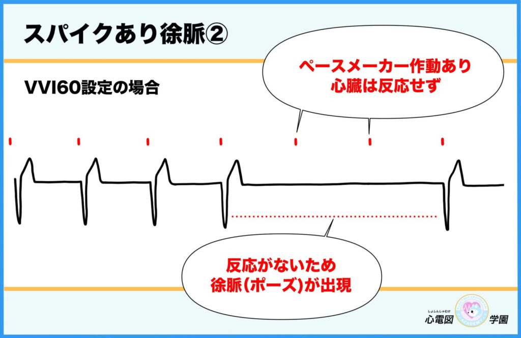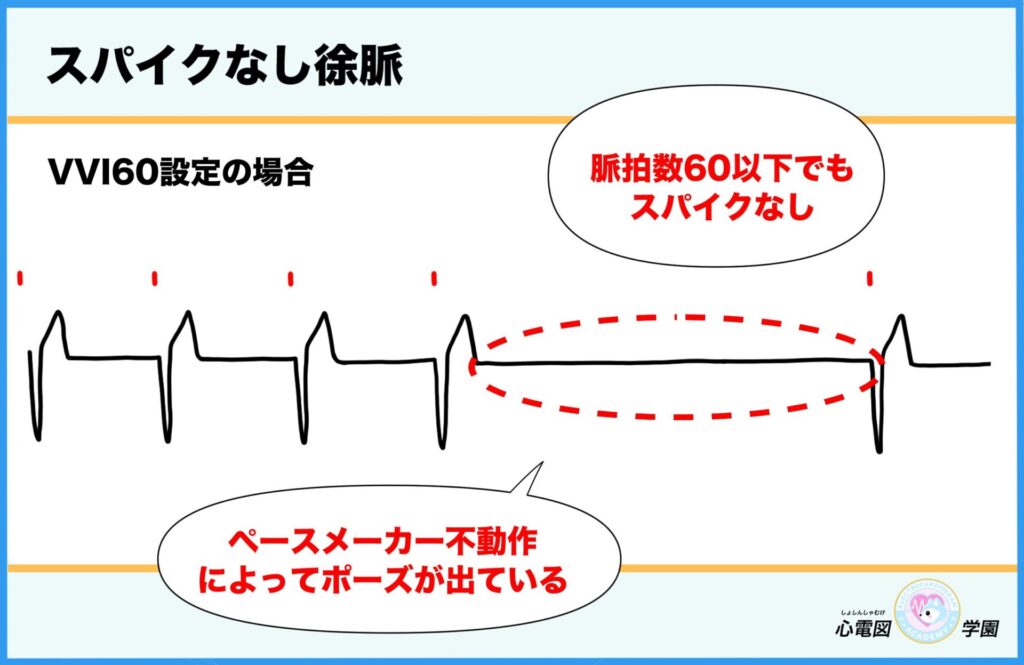 - そのときにスパイク(電気信号)が出ていなければ、ペースメーカーが作動していない可能性あり。