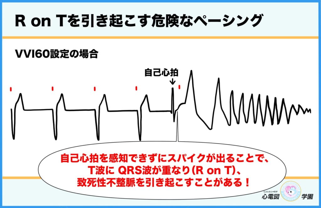 → ペースメーカーが自脈を感知できておらず、R on Tなどの危険な不整脈を引き起こすことがある。