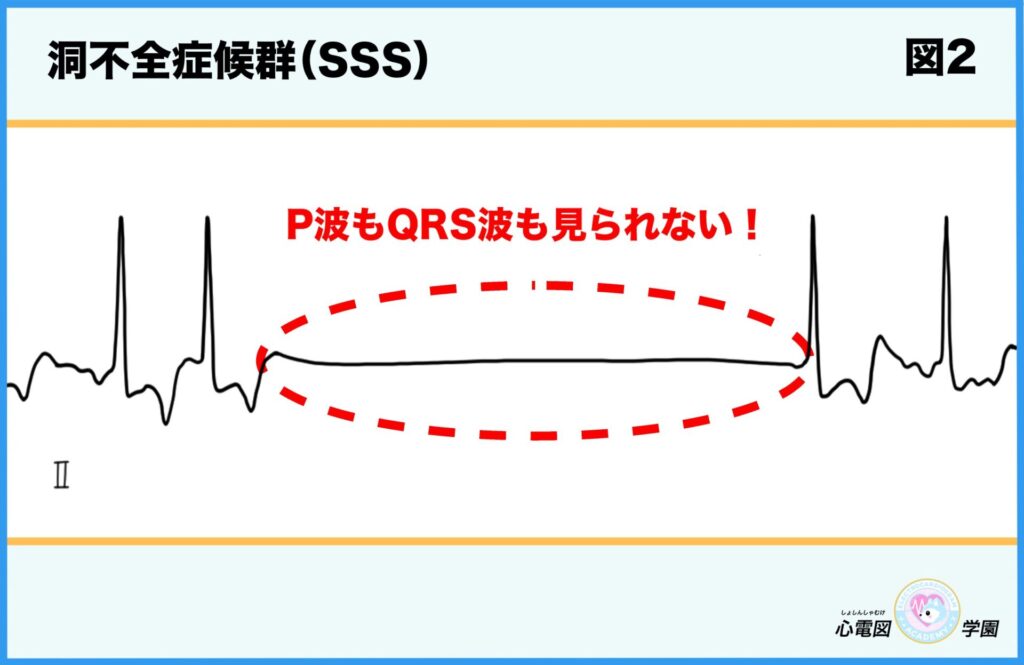 • 洞結節が一時的に命令を出さなくなることで、数秒間P波もQRSも消える
