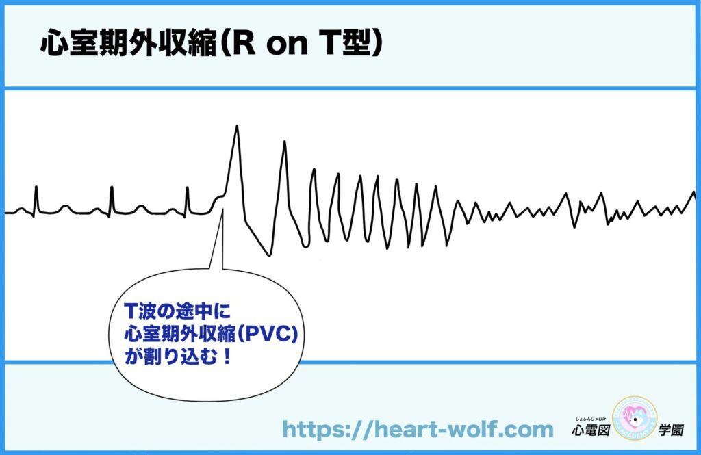 👉 T波の途中(心室が次の拍動に向けて“準備中〈回復中〉”のタイミング)に、PVCのR波が重なってしまう状態