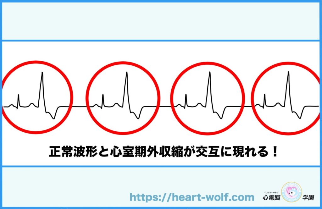 洞調律と心室性期外収縮が規則正しく交互に続く波形を